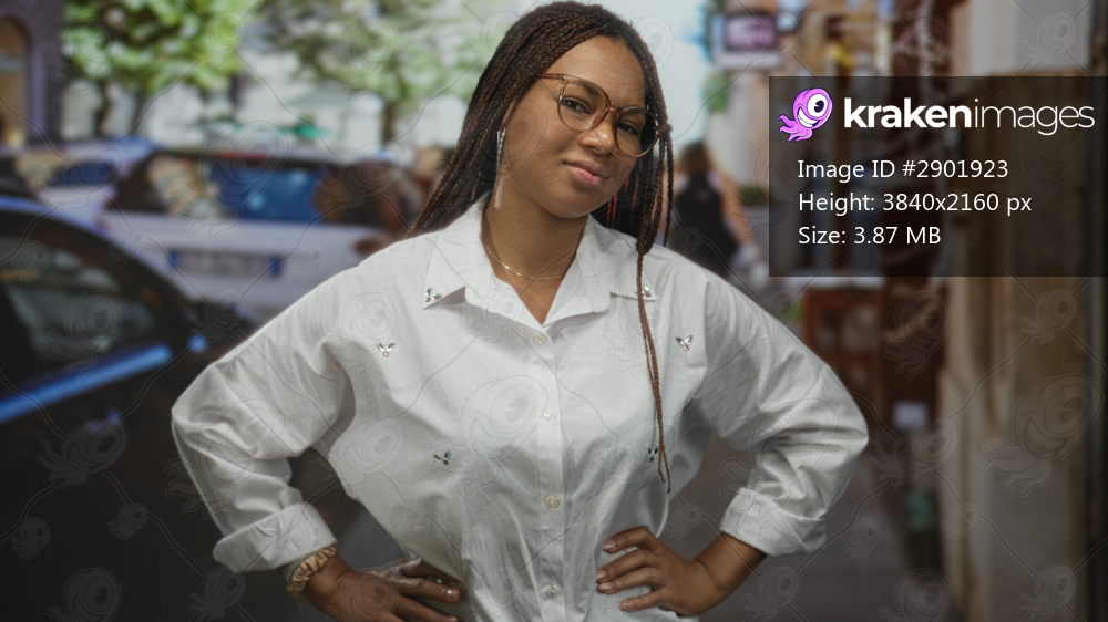 Woman with hands on hips on street wearing white shirt and glasses, braided hair and hoop earrings; confidence casual attitude.