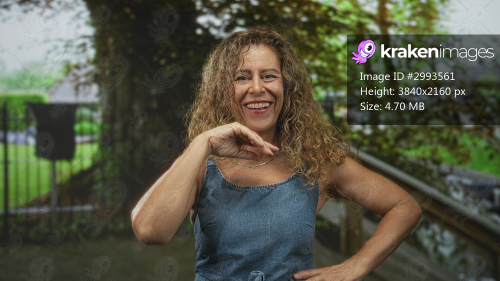 Woman with hands on hips posing on street by tree and iron fence, denim dress showing bare arms and smile; confidence vitality.