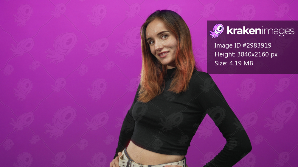 Woman hands on hips showing bare stomach in a black crop top in studio with magenta backdrop, slight smile and head tilt; confidence casual.
