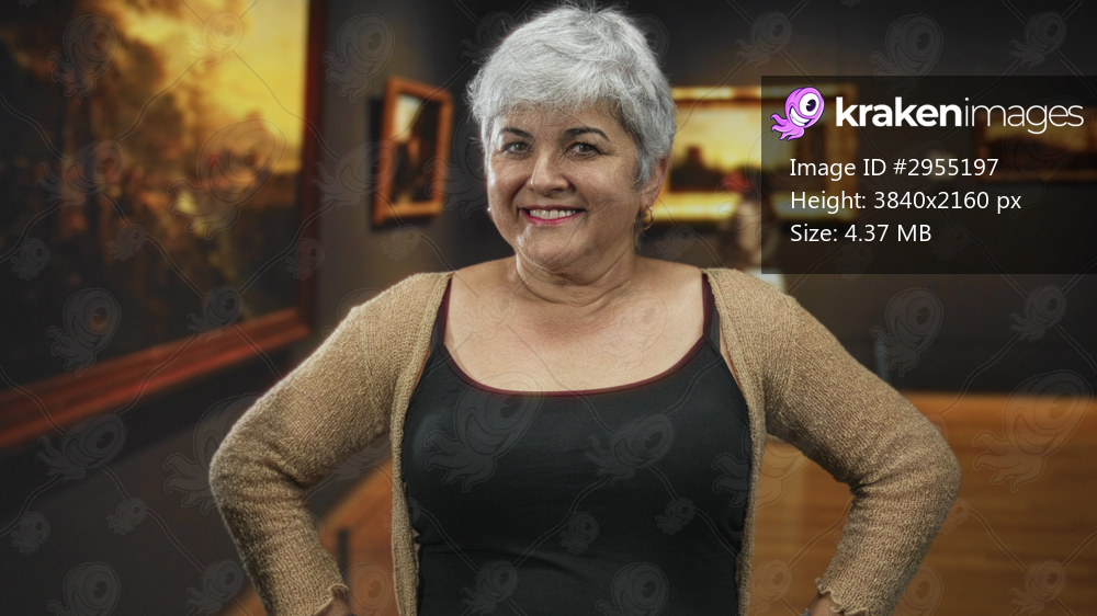 Woman hands on hips showing shoulders in museum building, smiling amid framed paintings and hardwood floor; confidence acceptance.