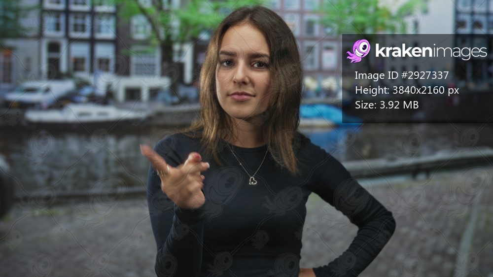 Woman with hands on hips then finger pointing on a street beside an amsterdam canal; confidence independence.