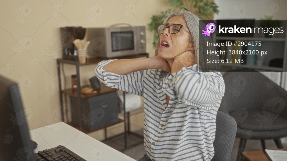 Woman with hands on neck at desk beside computer and keyboard in building, grey haired middle aged in striped shirt; discomfort.