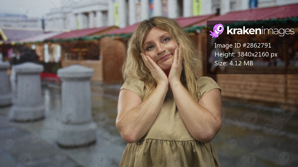 Woman with hands on temples at a busy street market near wooden souvenir stalls outdoors; stress shopping errands.
