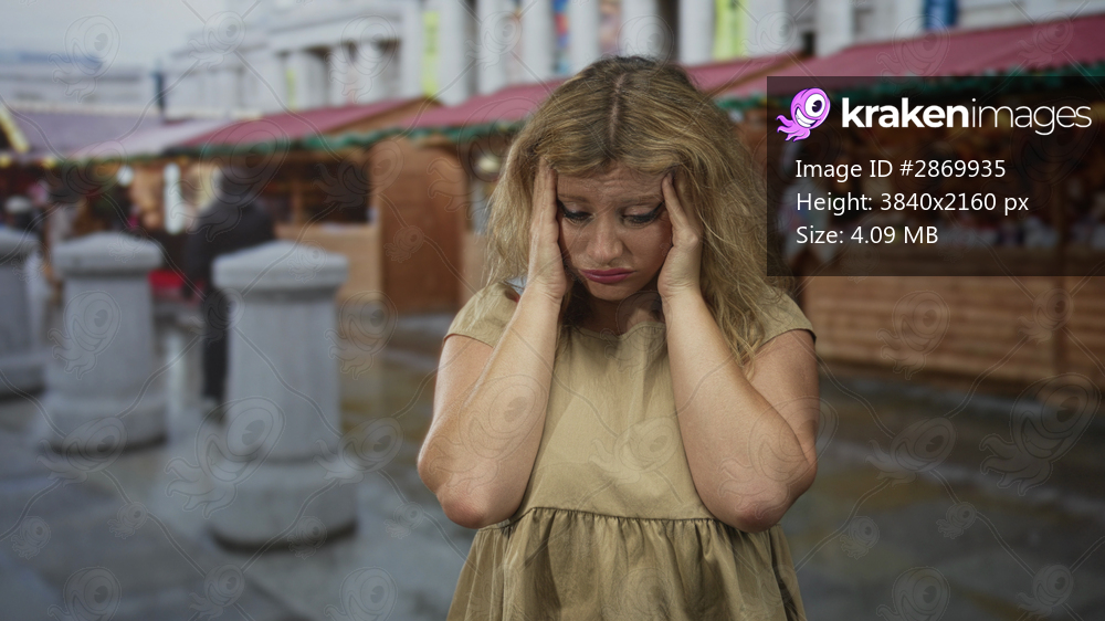 Woman with hands on temples at a busy street market near wooden souvenir stalls outdoors; stress shopping errands.