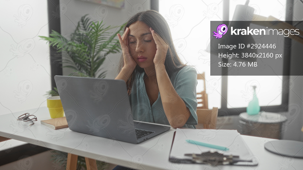 Woman with hands on temples at desk using laptop in home interior, holding head for headache; stress fatigue burnout.