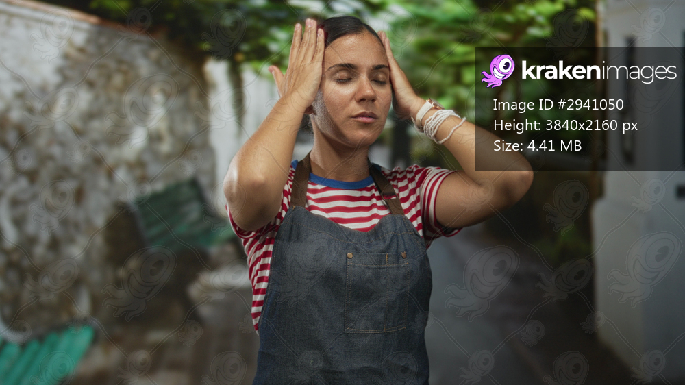 Woman with hands on temples for headache and face showing discomfort on a stone street wearing apron and striped shirt; stress fatigue.