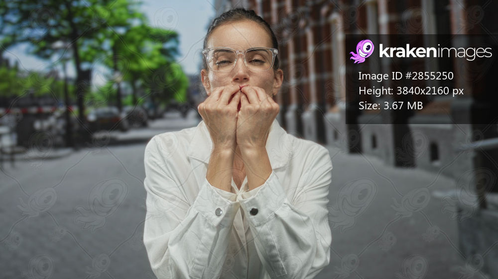 Woman with hands open blowing kisses on a city street wearing a white coat and clear glasses; playful affection.