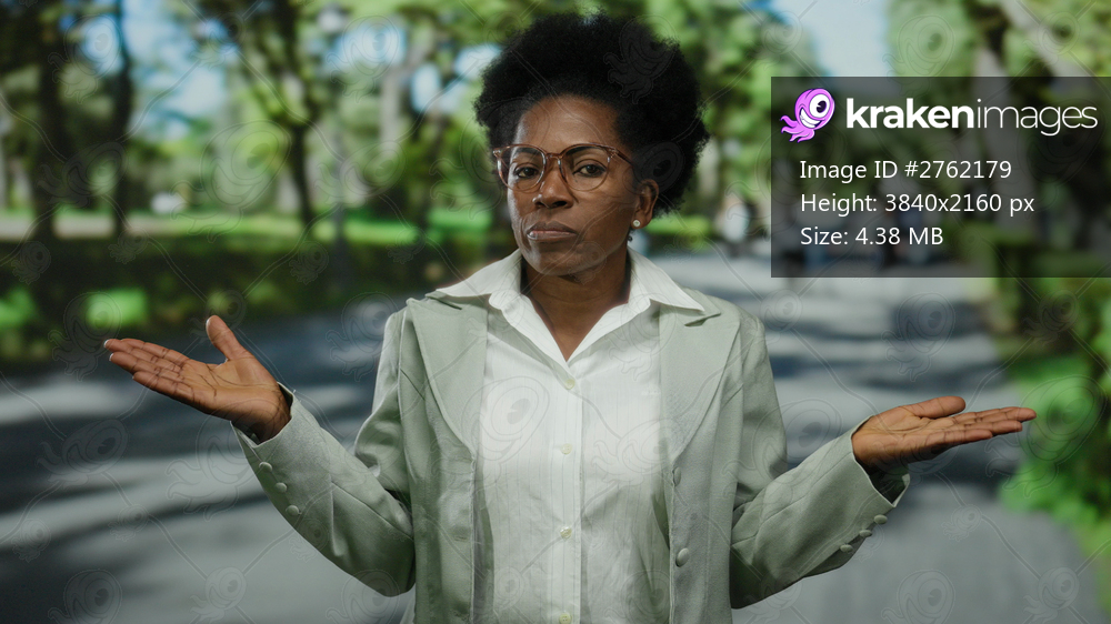 Woman with hands open in a park setting, expressing confusion or questioning, wearing glasses and a light suit, surrounded by blurred trees and people in the background. - Kraken Images