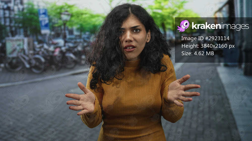 Woman with hands open pointing thumb to self on a busy city street in a mustard sweater and curly hair speaking to camera; confusion denial.