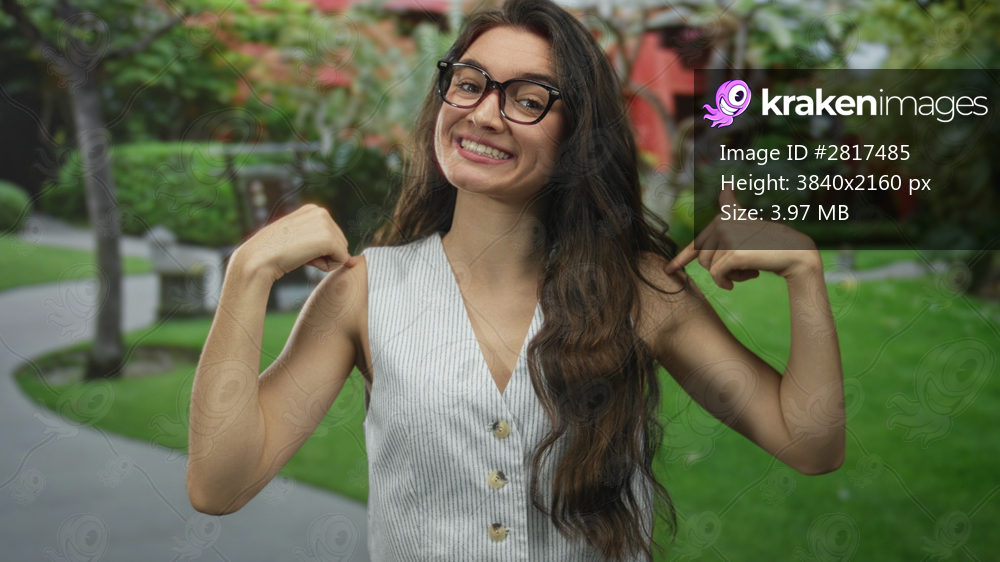 Woman with hands points thumbs to chest in forest; confidence.