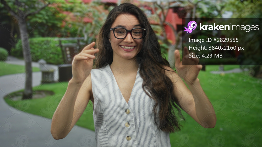Woman with hands points thumbs to chest in forest; confidence.