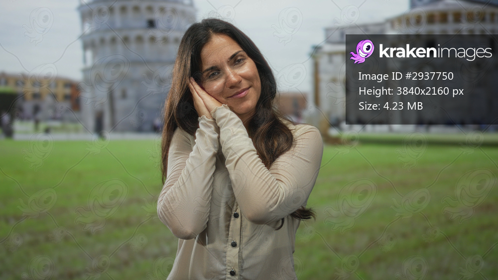 Woman with hands pressed at cheek resting eyes beside the leaning tower building in pisa outdoors; serenity rest travel.