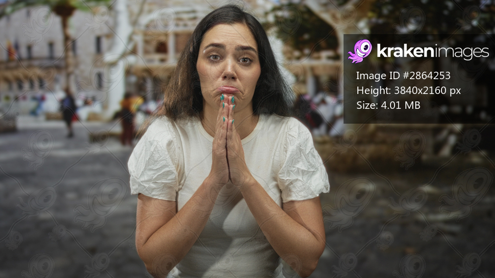 Woman with hands pressed in prayer gesture on bustling public cobblestone street beside stone building; desperation.