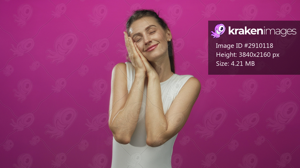 Woman with hands pressed to cheek, bare shoulders and a white sleeveless top against a bright magenta studio wall; serenity.