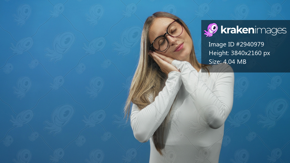 Woman with hands pressed to cheek and closed eyes, wearing glasses and long hair against a blue studio backdrop; calm relaxation.