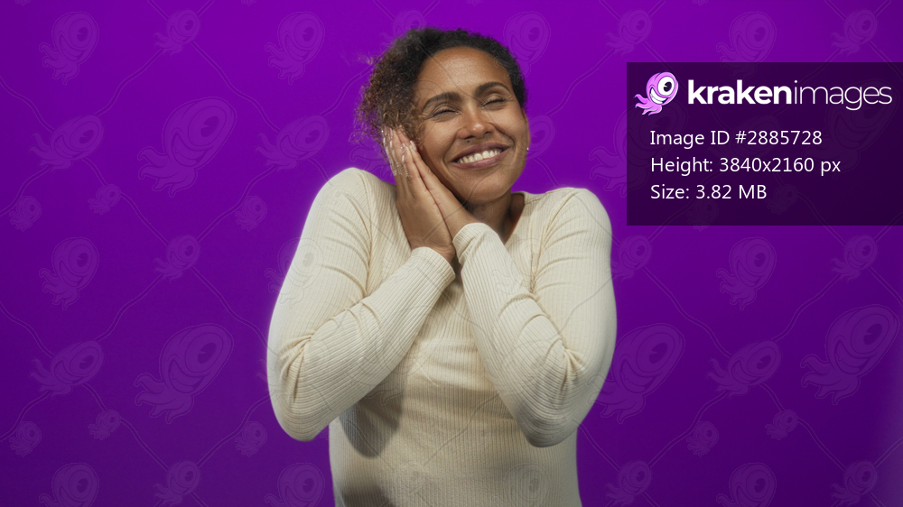 Woman with hands pressed to cheek and eyes closed in studio with purple wall; gentle rest peaceful comfort.