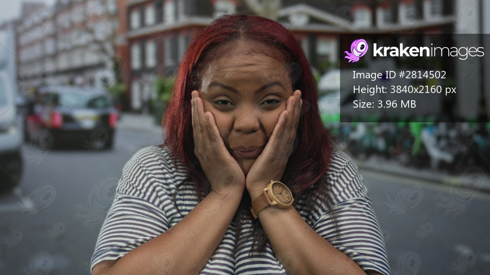 Woman with hands pressed to cheeks showing startled expression in city street environment; surprise.