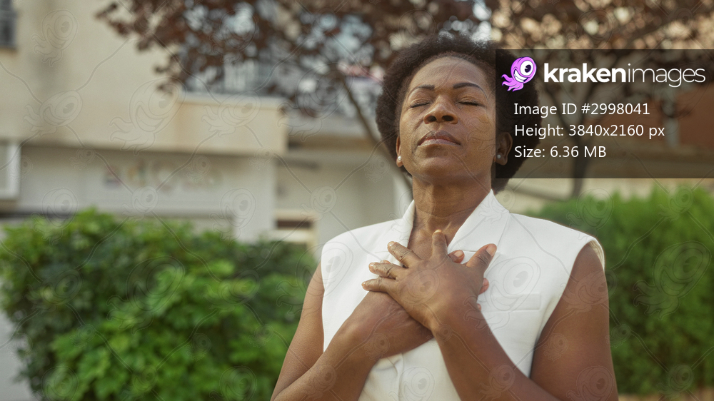 Woman with hands pressed to chest and closed eyes standing in front of a building facade beside hedges on street; serenity.