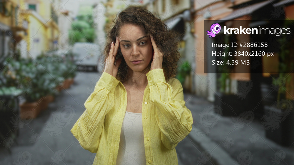 Woman with hands pressed to temples on a narrow street lined with potted plants and cafe storefronts, wearing yellow shirt and white tank top; stress headache fatigue. - Kraken Images