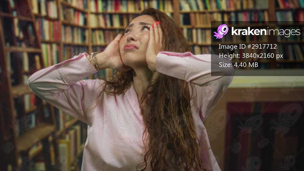 Woman with hands pressed to temples and palms raised, face looking up amid shelves of books in library building; exam anxiety.