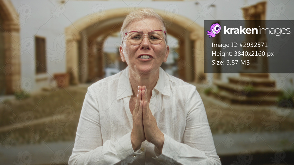 Woman with hands pressed together at chin on an old town street wearing glasses and white shirt in front of archway; hope gratitude devotion.