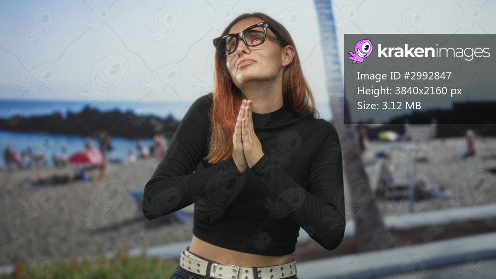 Woman with hands pressed together in a praying gesture on a street near the beach, wearing glasses and black turtleneck, freckled young; hope reflection. - Kraken Images