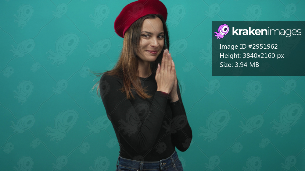 Woman with hands pressed together in a praying gesture, wearing a red beret and black top against a teal studio backdrop; playful charm.