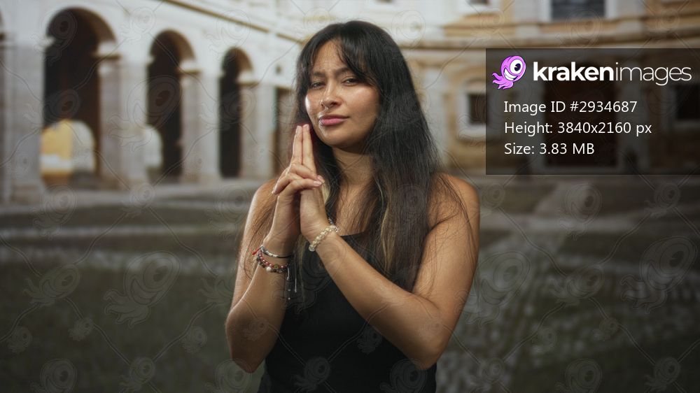 Woman with hands pressed together in building courtyard of an old town outdoors, brunette in black sleeveless shirt and bracelets, facing camera; serenity. - Kraken Images