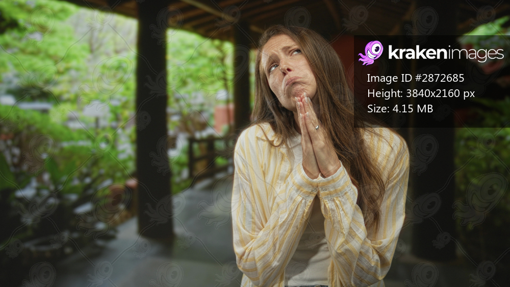 Woman with hands pressed together in pleading pose in a hotel corridor with pillars and greenery; anxious hope.