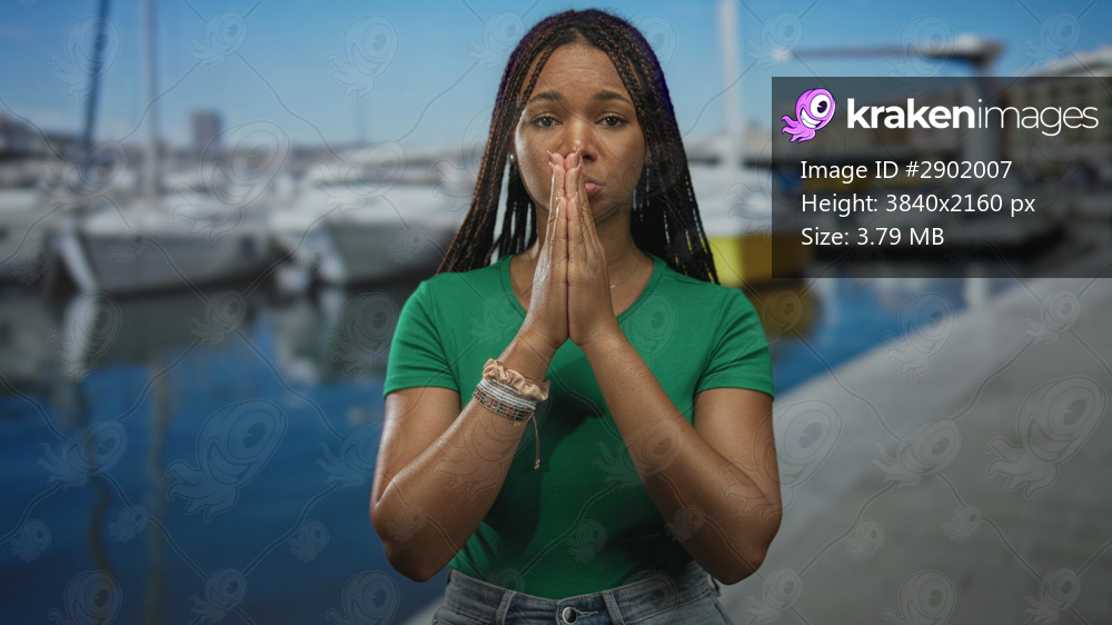 Woman with hands pressed together in prayer at a marina pier, green shirt and braided hair; serenity hope prayer.