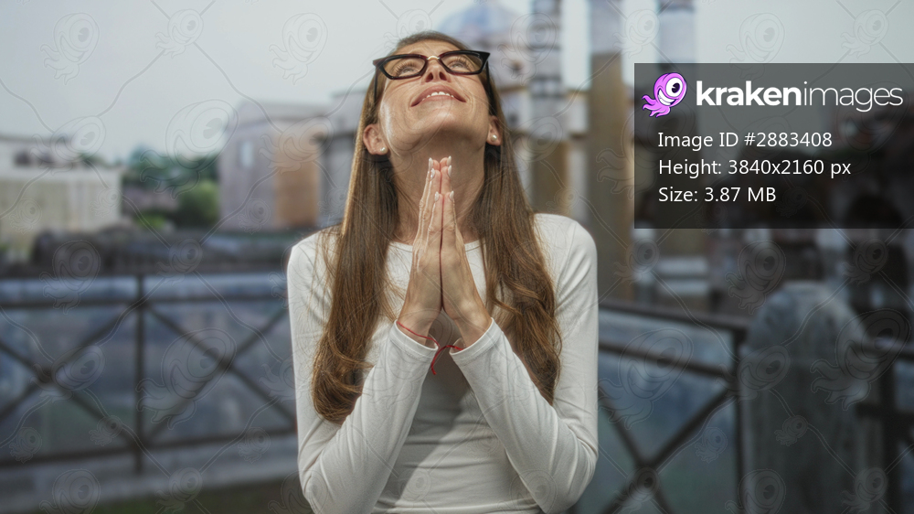 Woman hands pressed together in prayer looking upward on an outdoor balcony by roman ruins with stone columns and arches; faith hope devotion.