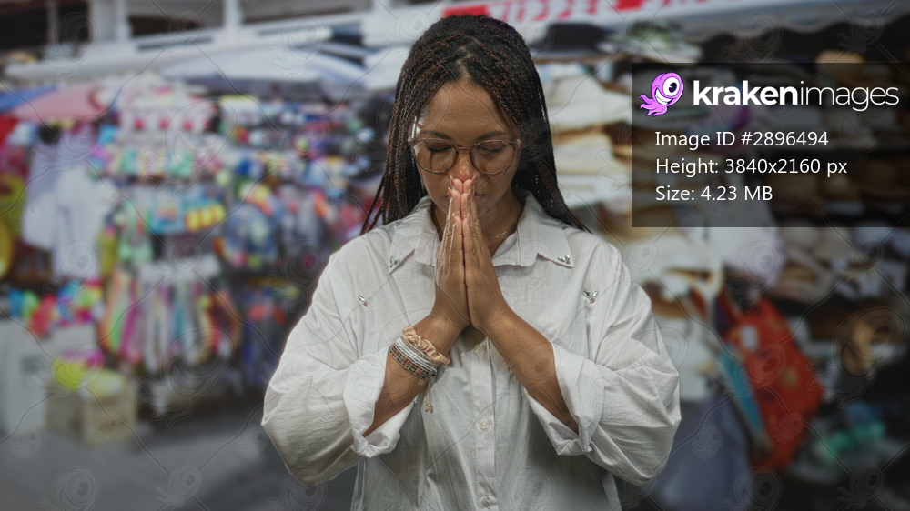Woman with hands pressed together in prayer on a busy street market stall, wearing glasses and bracelets, eyes closed in quiet pose; calm reflection.
