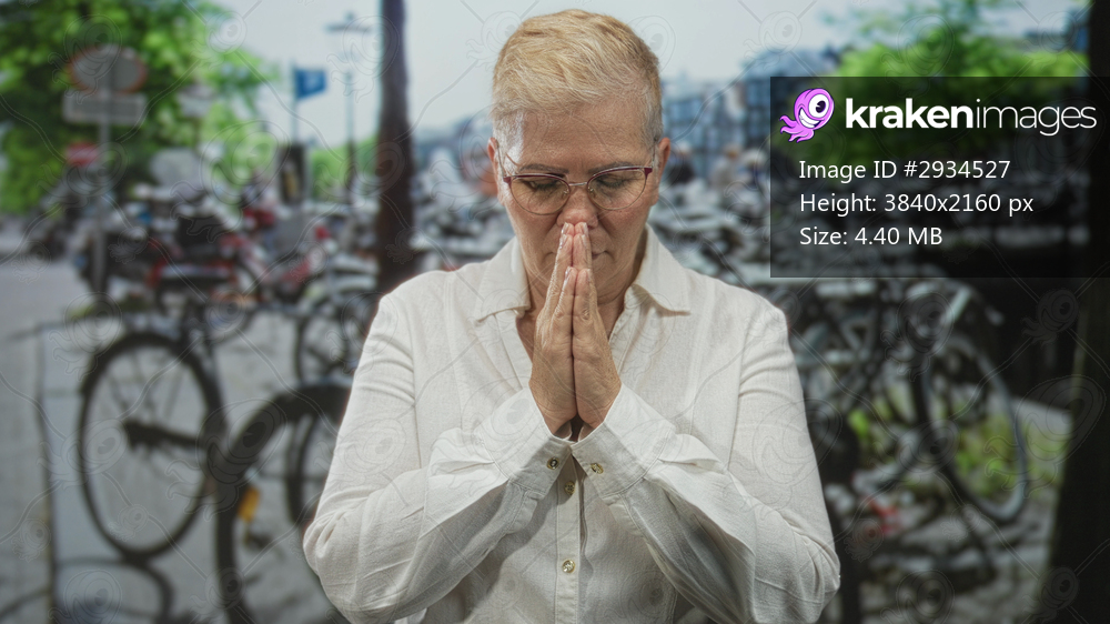 Woman with hands pressed together in prayer on a street with parked bicycles and closed eyes; serenity.