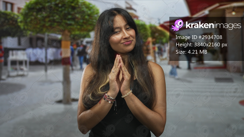 Woman with hands pressed together in prayer on downtown street wearing bracelets and rings; quiet gratitude.