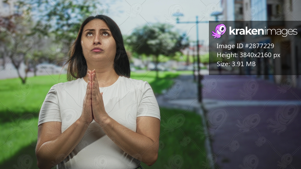 Woman with hands pressed together in prayer on the city street sidewalk; hope faith pleading resolve.