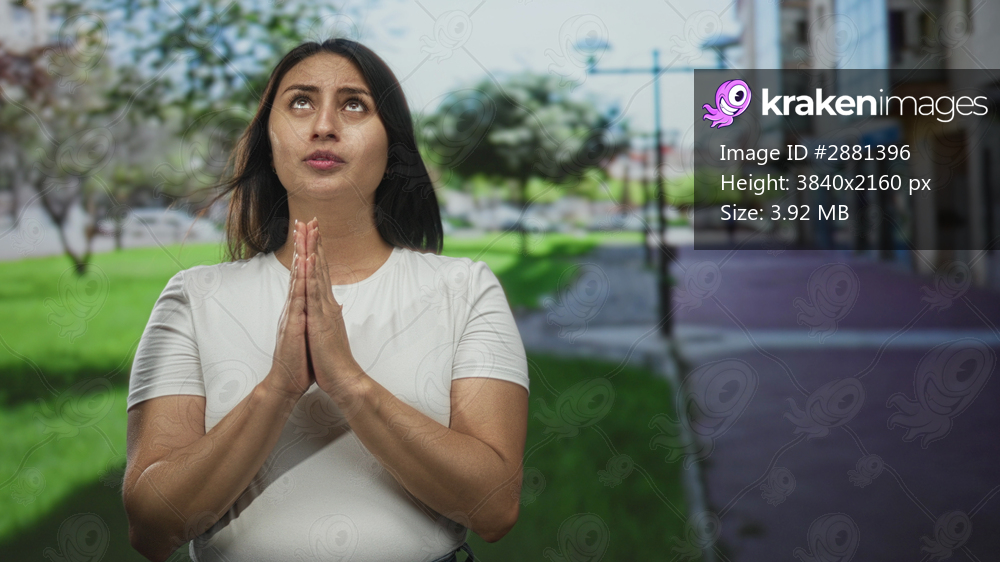 Woman with hands pressed together in prayer on the city street sidewalk; hope faith pleading resolve.