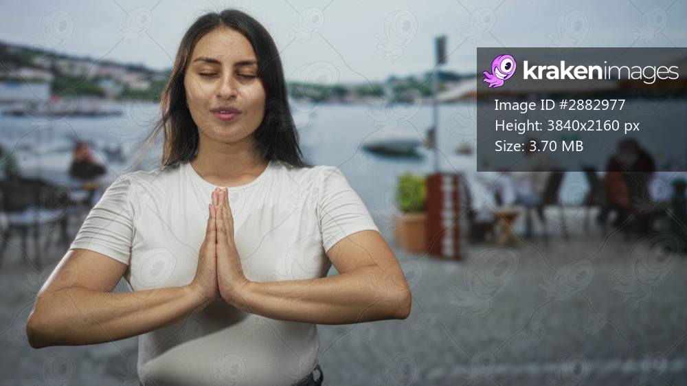 Woman with hands pressed together in prayer pose at a restaurant terrace on street waterfront; serenity.