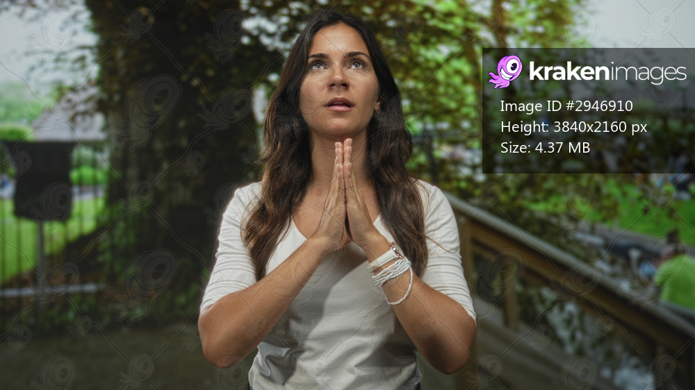 Woman with hands pressed together in prayer pose in park near wooden railing and trees, eyes closed in focused concentration; serenity meditation.