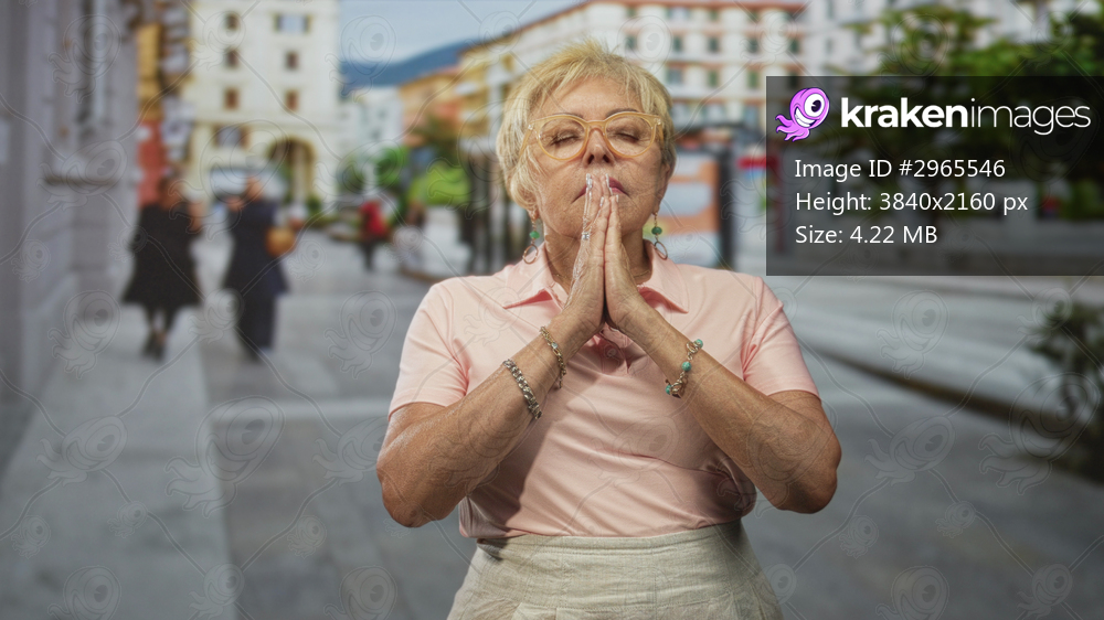 Woman with hands pressed together in prayer, wearing pink polo and glasses on a pedestrian street with buildings and trees behind; reflection gratitude serenity. - Kraken Images
