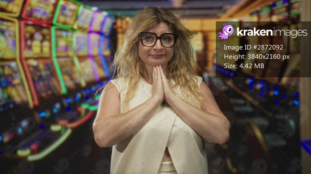Woman with hands pressed together and pleading expression in a casino slot machine aisle; seeking luck hopeful.