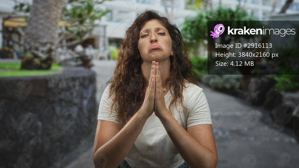 Woman with hands pressed together and pouting face on a city street near stone wall and tropical plants, wearing white t shirt and jeans, visible hands and arms; pleading hope. - Kraken Images