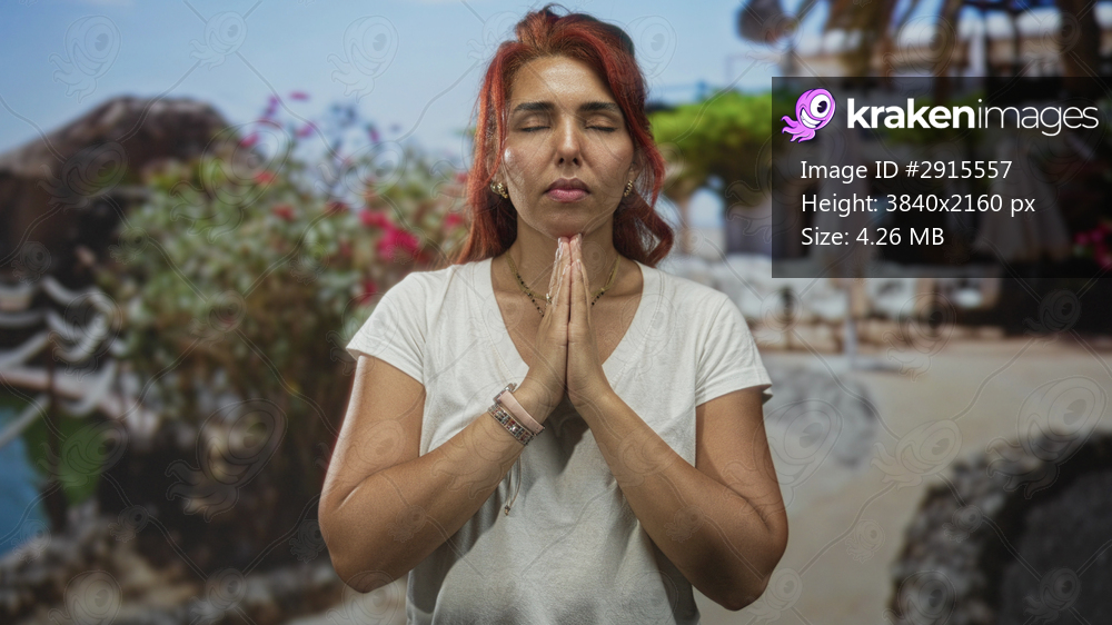 Woman with hands pressed together praying in front of a seaside building, eyes closed in quiet devotion; serenity mindfulness.