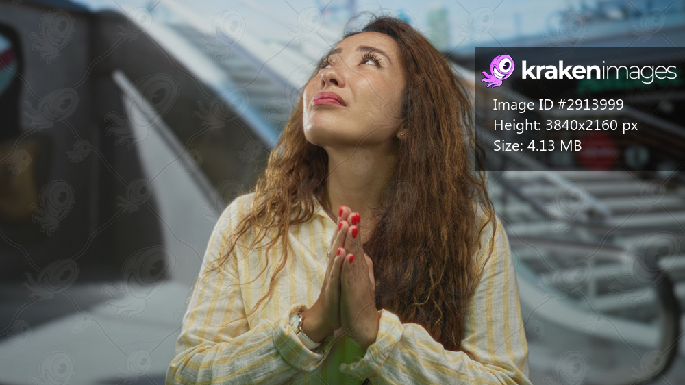 Woman with hands pressed together praying in mall center shop indoors looking upward at ceiling; hope prayer.