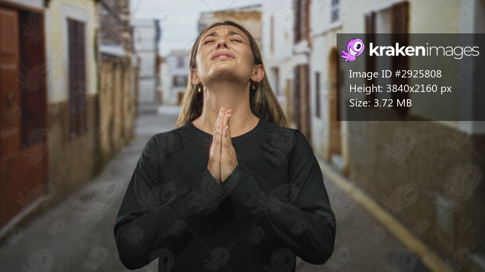 Woman with hands pressed together praying and looking upward in a narrow sunlit street between shuttered buildings; hope faith.