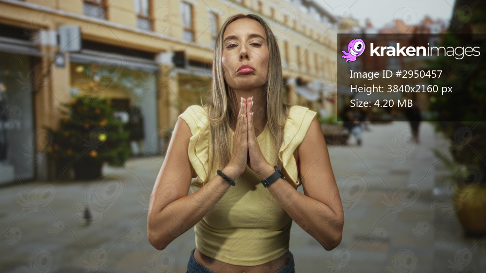 Woman with hands pressed together praying on city street wearing sleeveless crop top and jeans; calm reflection.