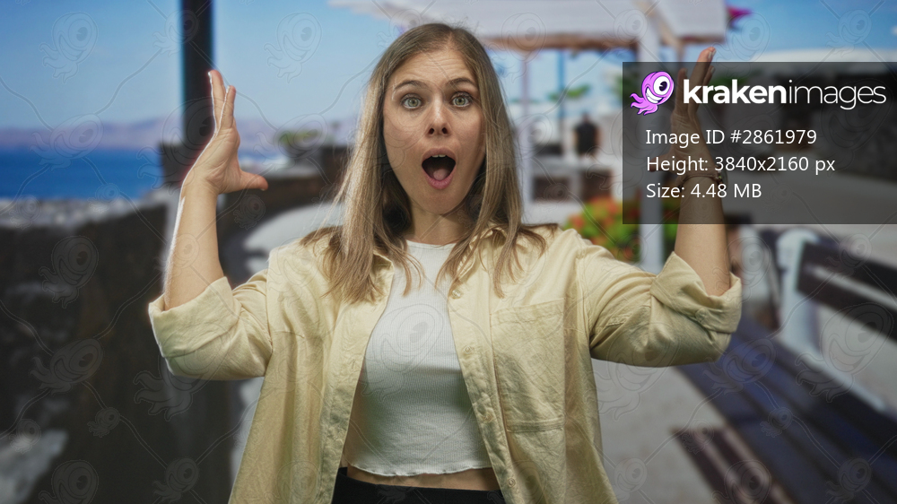 Woman with hands pressing temples in bright seaside street wearing casual attire and thoughtful posture; calm reflection introspection mood.