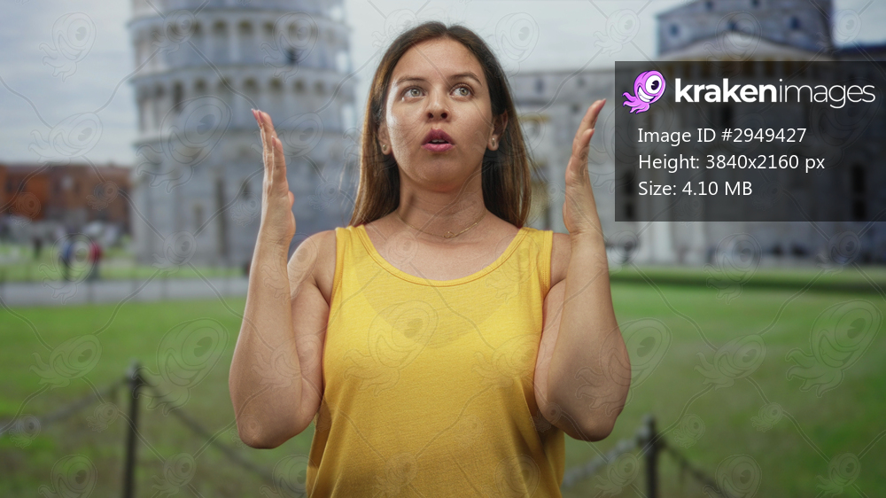 Woman with hands raised above shoulders gesturing in front of building pisa tower wearing yellow tanktop and necklace; travel frustration.