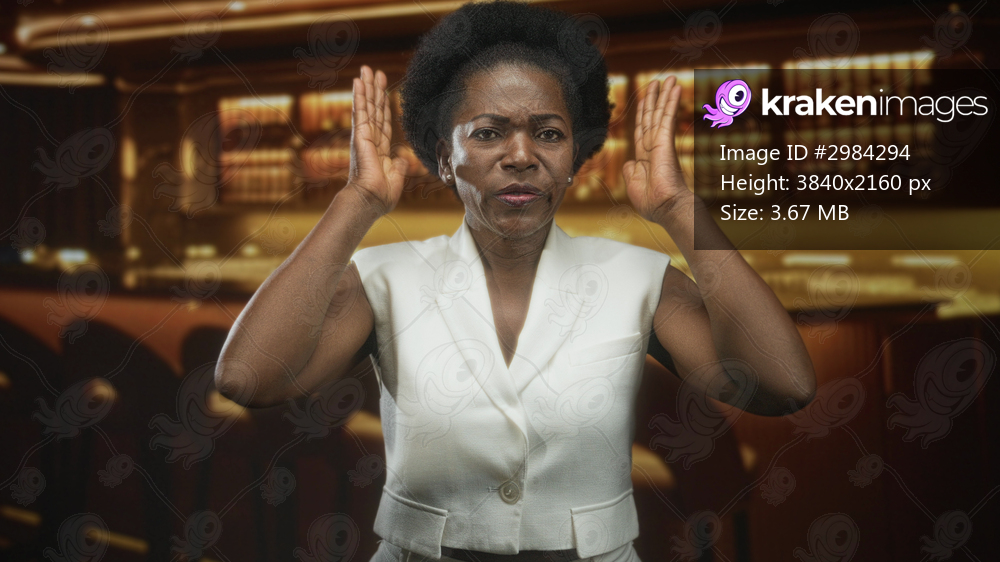 Woman with hands raised beside head, palms visible and mouth open, wearing white sleeveless vest, standing before illuminated bar shelves and stools in interior building; surprise concern. - Kraken Images