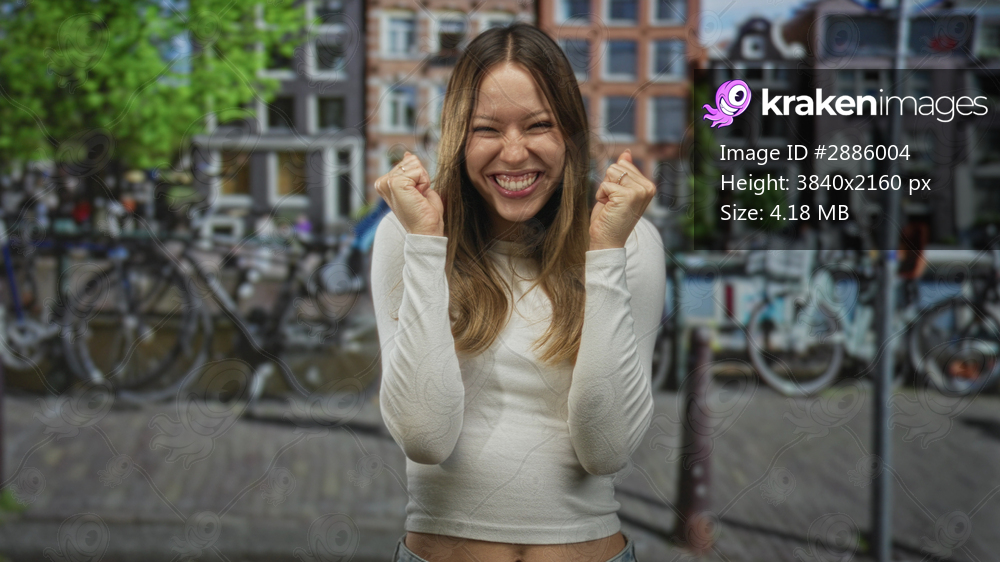 Woman with hands raised cheering on a city street, wearing white shirt and jeans, smiling broadly; joy celebration.