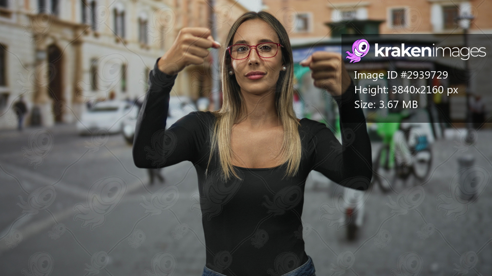 Woman with hands raised and fingers pinching in a pulling gesture on a street with kiosks and bicycles; confidence empowerment.